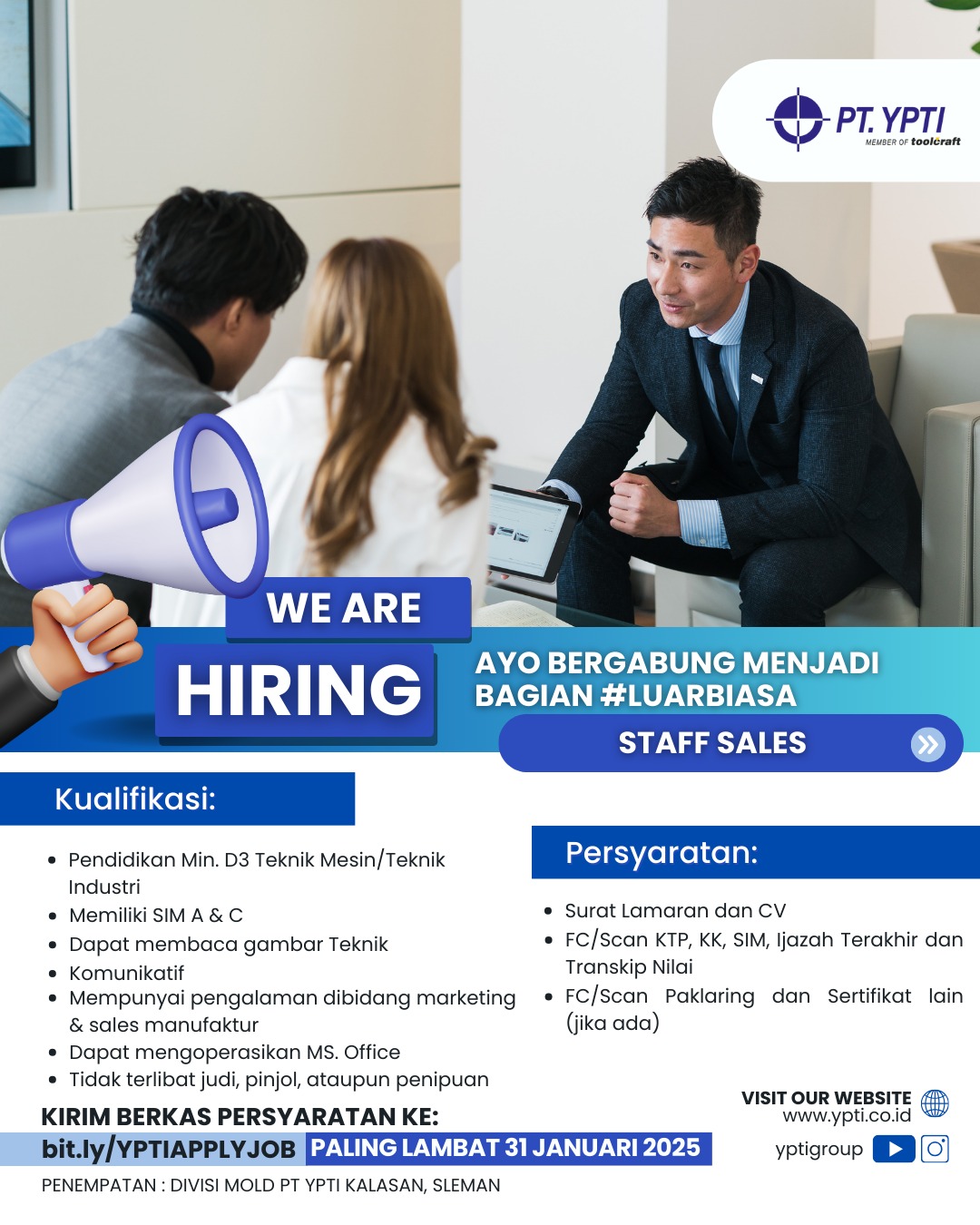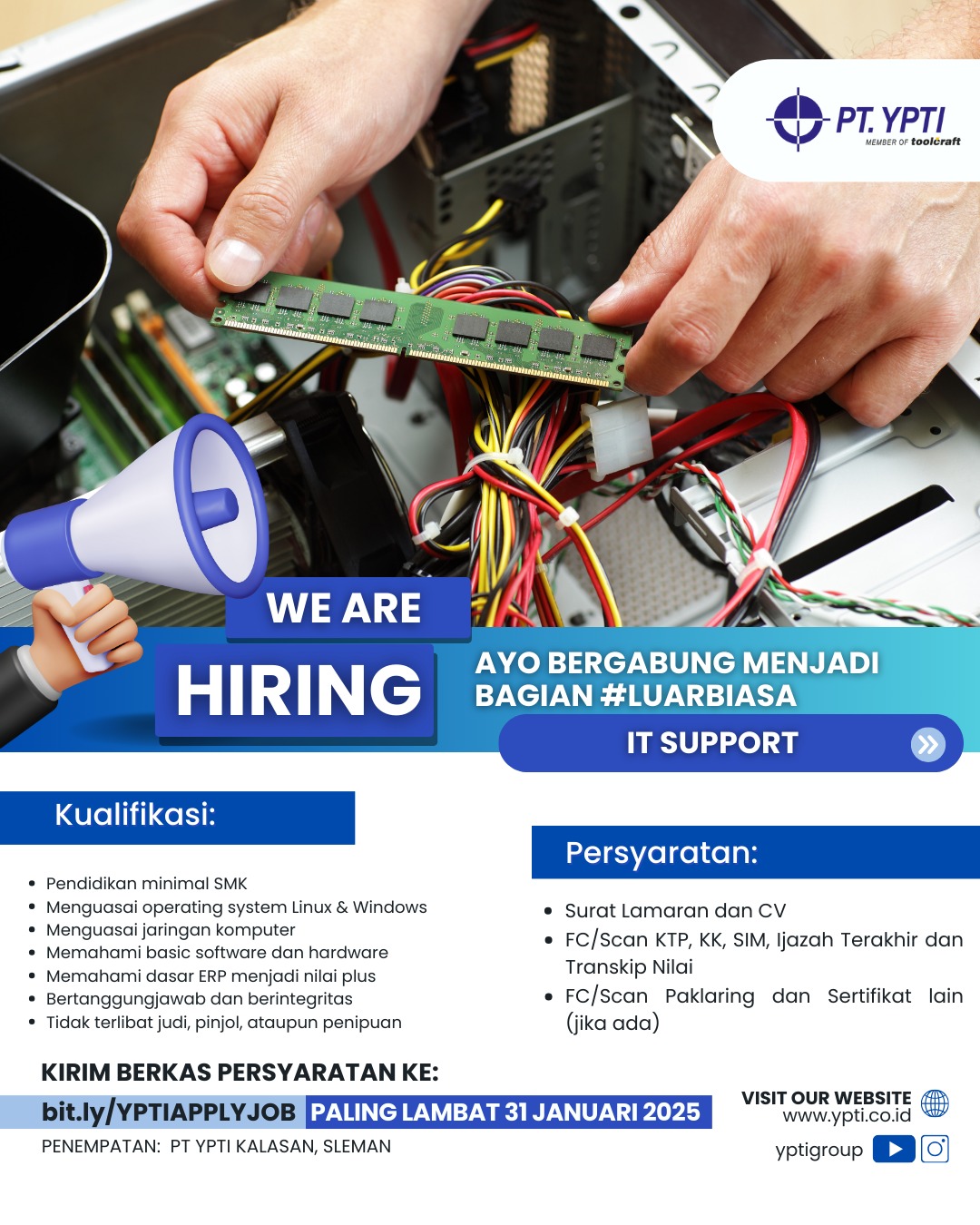 PT Yogya Presisi Teknikatama Industri (PT YPTI), perusahaan yang bergerak di bidang percetakan produk plastik, bagian-bagian otomotif, elektronik, sistem edukasi, dan produk kemasan mengajak Rekanaker bergabung mengisi posisi IT Support dan Staff Sales